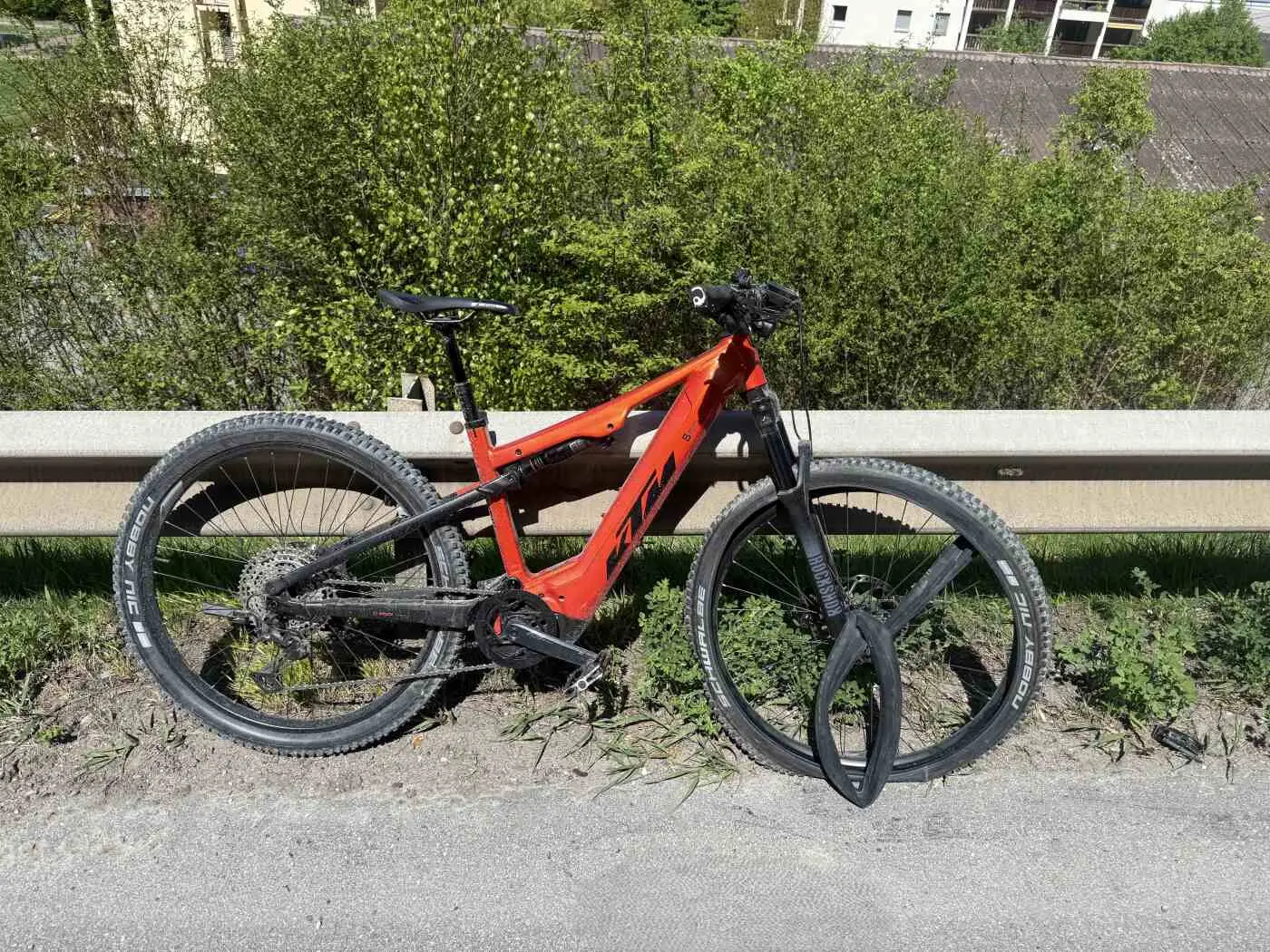 Bici da montagna arancione appoggiata a un guardrail, con vegetazione verde sullo sfondo. La ruota anteriore è inclinata.