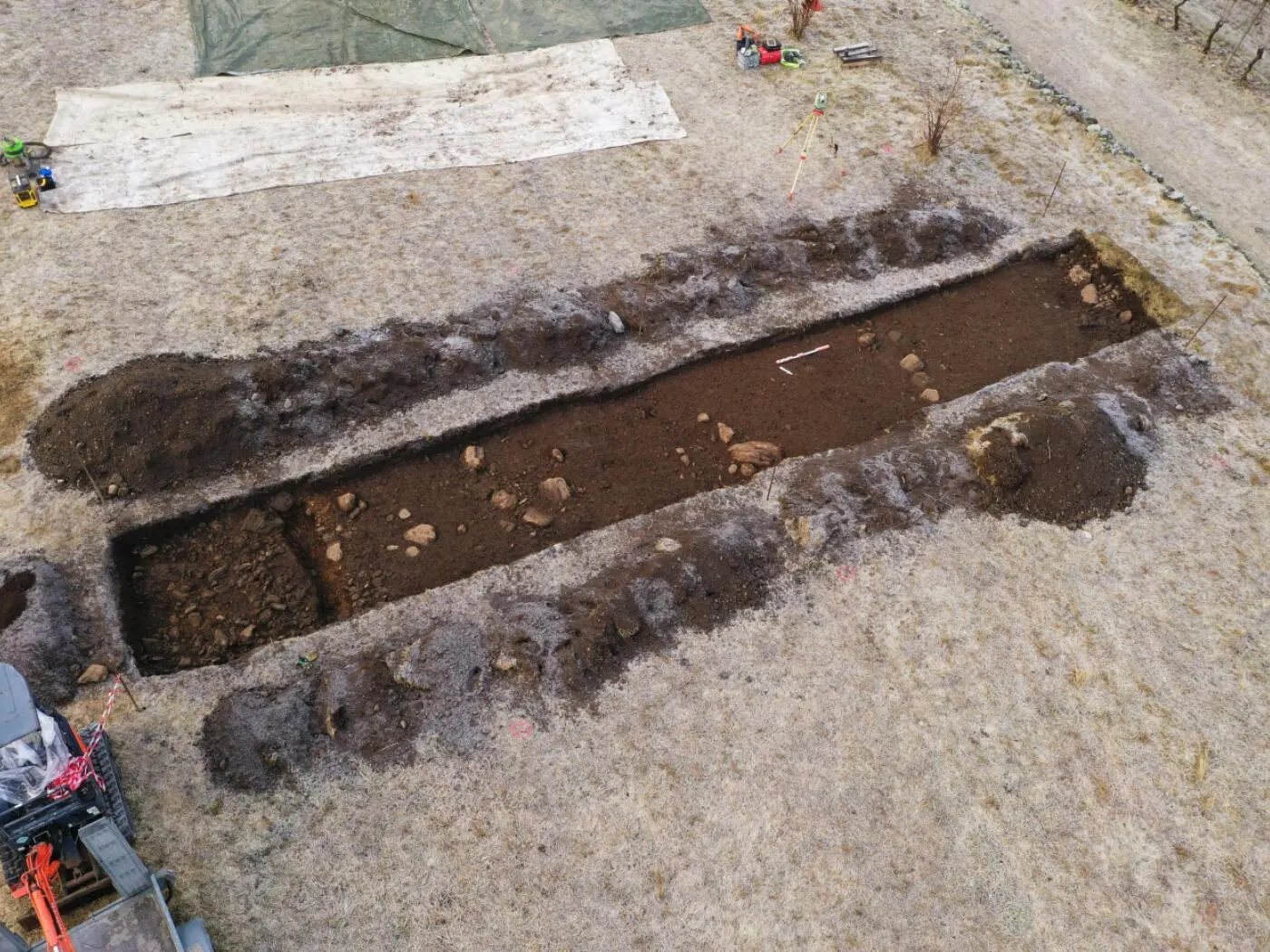 Scavo archeologico con un lungo fossato rettangolare nel terreno. Sono visibili pietre e vari strumenti di lavoro nelle vicinanze. Il terreno è secco e spoglia.