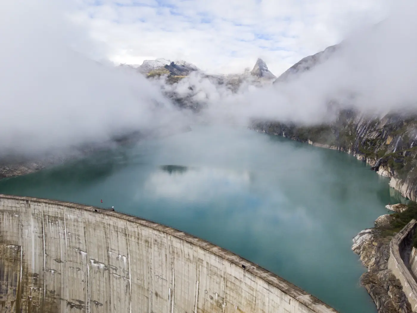 Una diga imponente circondata da montagne nebbiose, con un lago azzurro tranquillo che riflette il cielo nuvoloso.