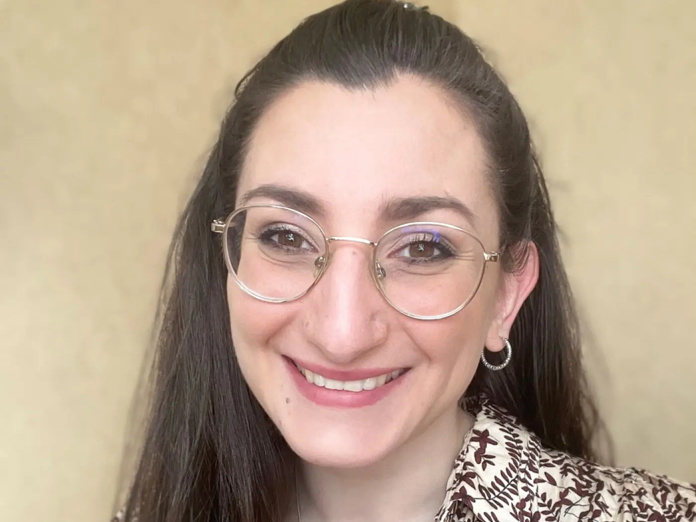 Una giovane donna con capelli lunghi e scuri, indossa occhiali rotondi e orecchini a cerchio. Sorridente, posa davanti a uno sfondo neutro.