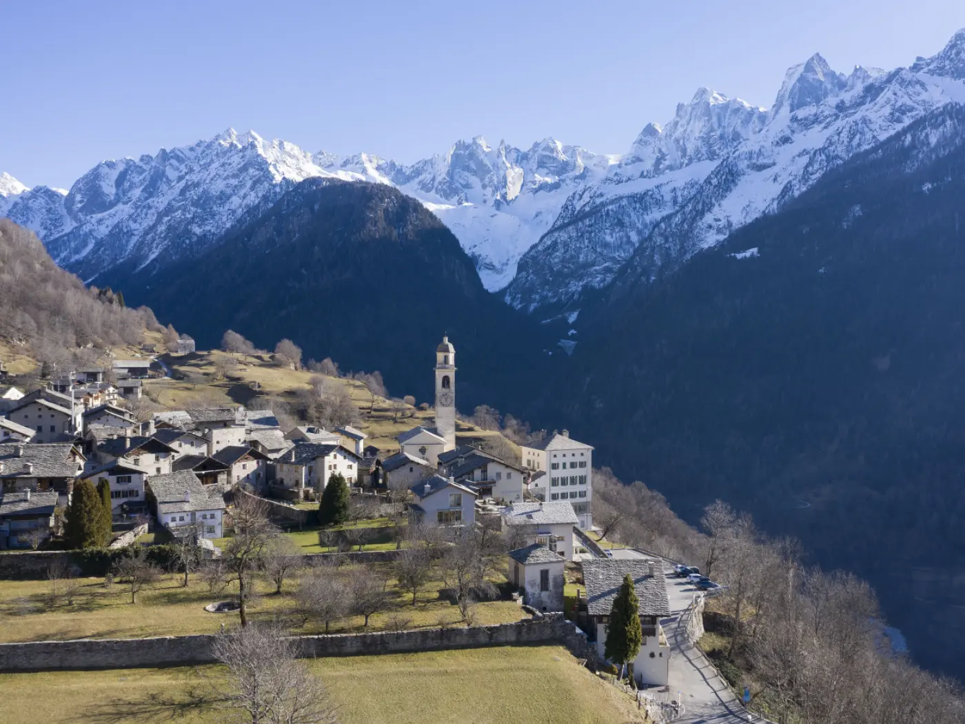 Villaggio alpino con case in pietra e un campanile, circondato da montagne innevate. Il cielo è sereno e blu.