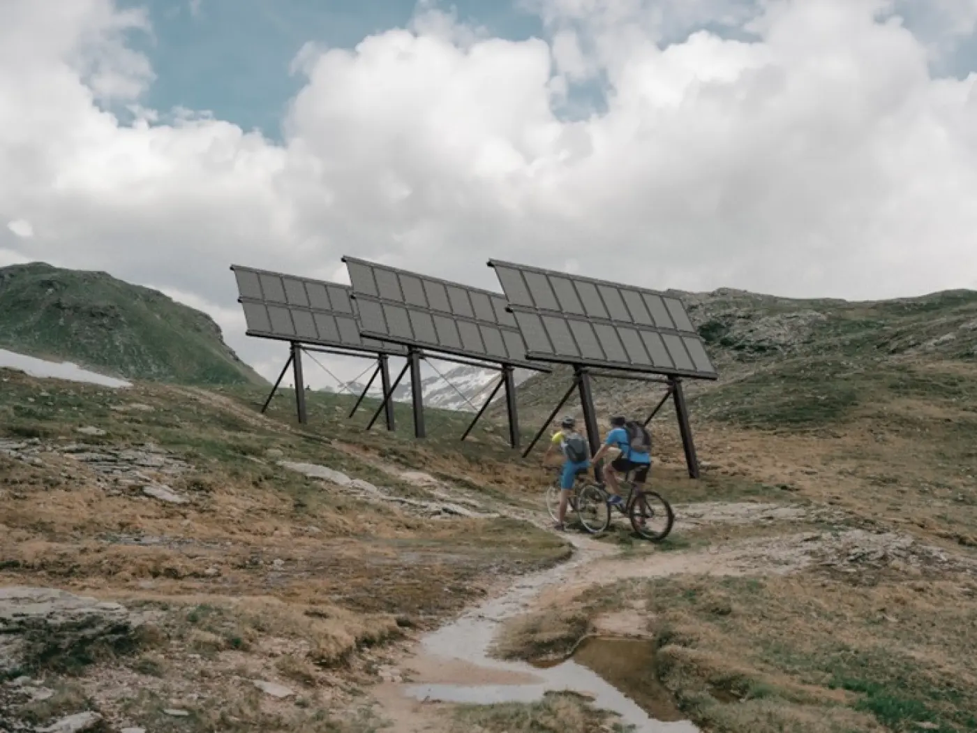 Due ciclisti in un paesaggio montano, con pannelli solari sullo sfondo. Il cielo è parzialmente nuvoloso e il terreno è verde e secco.