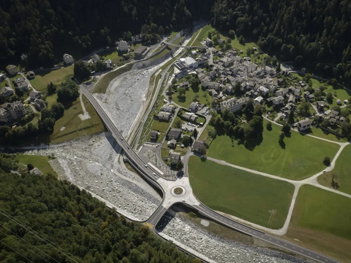 Tornando al progetto, oggi termina un capitolo durato quattro anni esatti. La prima pietra del progetto dello studio d'ingegneria Conzett Bronzini Partner è stata posata l'11 settembre 2021. Quel giorno sono cominciati i lavori di un cantiere che ha unito costruttori di opere idrauliche e stradali, architetti, architetti paesaggisti e ingegneri. La strada e i ponti sono stati rialzati di oltre cinque metri. In questo modo, se il Pizzo Cengalo dovesse muoversi nuovamente e del materiale dovesse giungere a valle, i detriti non dovrebbero danneggiare le infrastrutture e i paesi di Bondo, Spino, Sottoponte e Promontogno.
