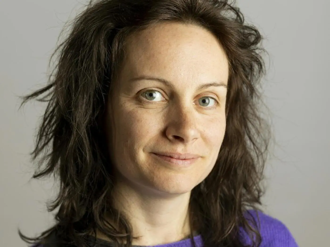 Non so chi sia. Donna con capelli ricci e disordinati, indossa un maglione viola e ha uno sguardo sereno.