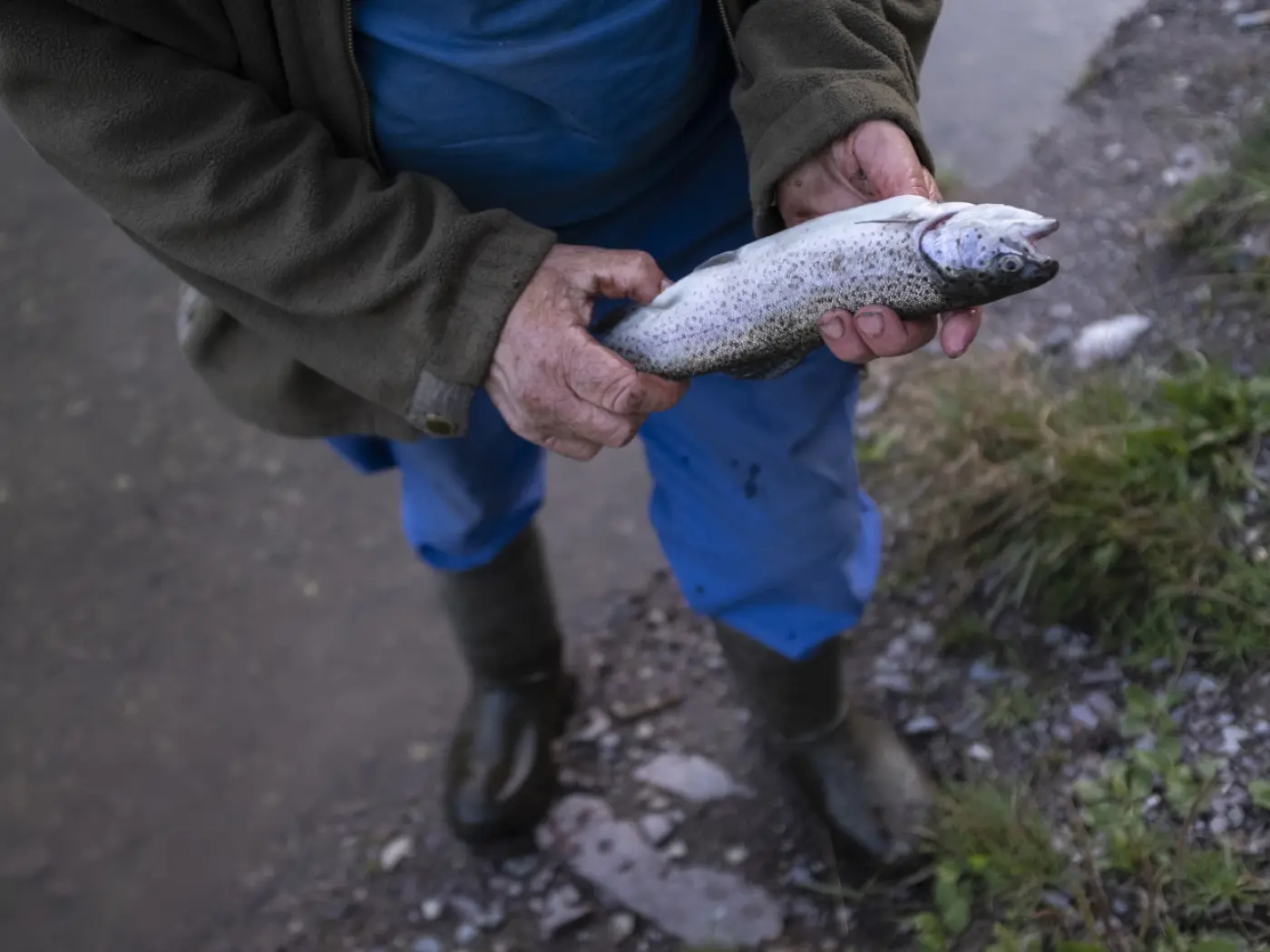 Un uomo tiene un pesce appena pescato con le mani, mentre si trova vicino all'acqua. Indossa stivali di gomma e un abbigliamento caldo, circondato da