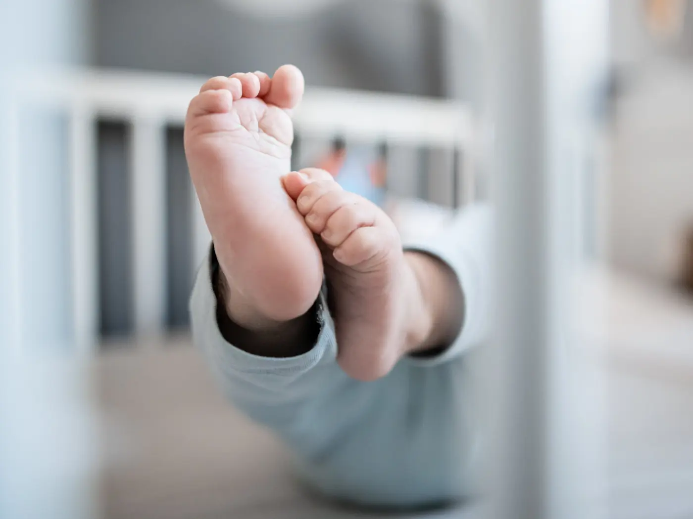Due piccoli piedi di un bambino mostrano le dita e il tallone mentre si allungano verso l'alto in un lettino.