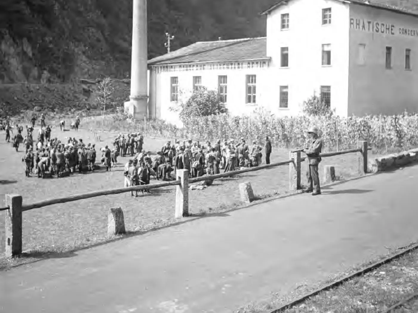 Gruppo di persone sedute all'aperto in un'area circostante un edificio, con un uomo in uniforme che osserva. Sullo sfondo, un edificio con la scritta "R